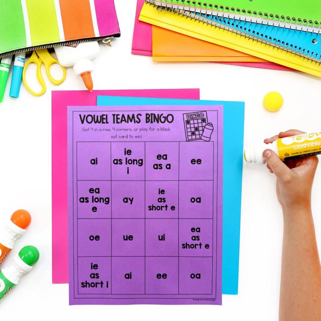 - Vowel Team Bingo– Everyone always loves playing bingo! I have talked here before about playing syllable bingo, but you can also easily change it up simply by changing the phonics rule. Have students create their own bingo board from a set of vowel teams you provide. The teacher calls out a word, and students mark the corresponding vowel team on their board. Then, as you play, you can have them get a bingo in different ways (diagonally, vertically, horizontally, picture frame, or blackout).