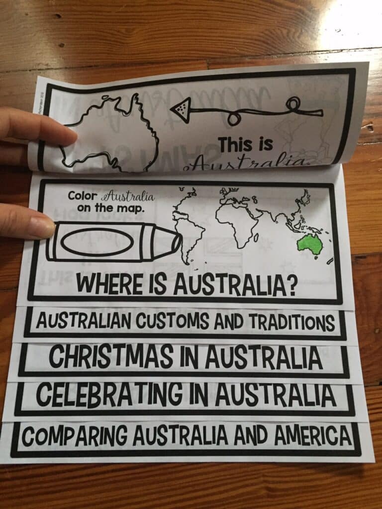 When I first started teaching Christmas Around the World, we had so many different crafts, cut-and-pastes, reading passages, and more to keep up with for each country we visited. I wanted to simplify it. To do this, I put everything in a flip up book format! Then, as we learn about and visit the country, we have everything in one place.