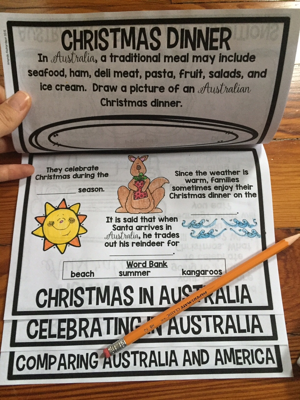 You can begin by introducing students to all there is to explore in Australia with this nonfiction book. It tells all about the major traditions, foods, activities, and celebrations that take place in Australia at Christmastime. Students get to explore what it’s like to celebrate Christmas in a wam climate, much different than our climate in the United States. This book helps provide background knowledge as students learn more about Christmas in Australia.