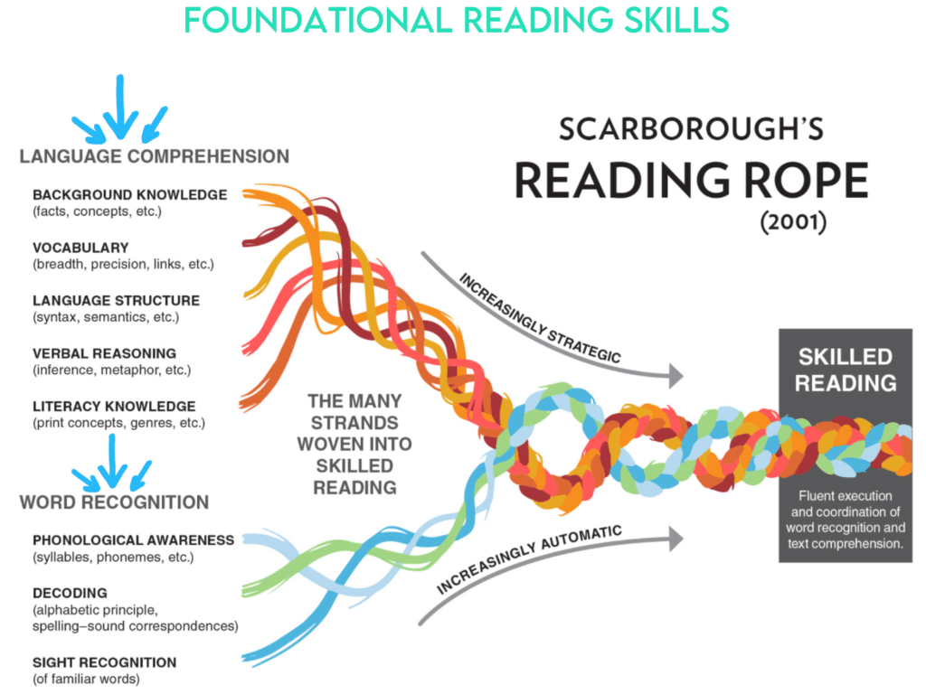 In the image, you’ll see multiple strands twisting together. On one side, language comprehension strands become increasingly strategic. On the other side, word recognition strands become increasingly automatic.