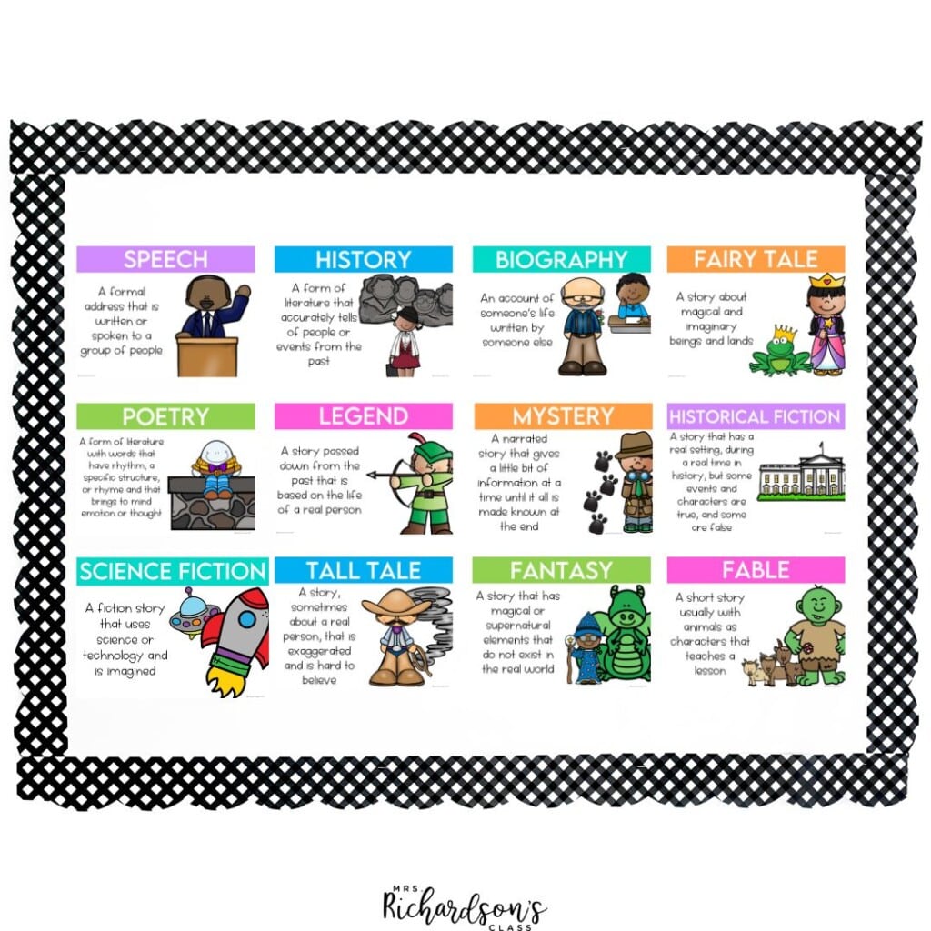Using anchor charts and genre sorting activities can make this learning stick. You can find this set of Reading Genre Posters HERE.